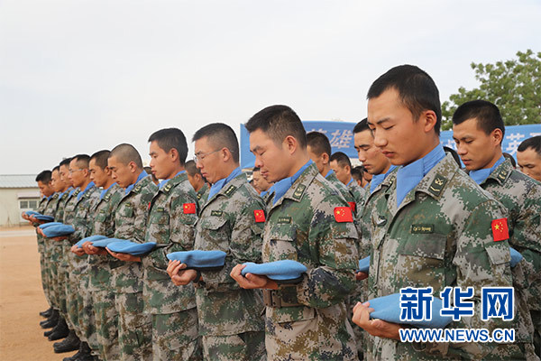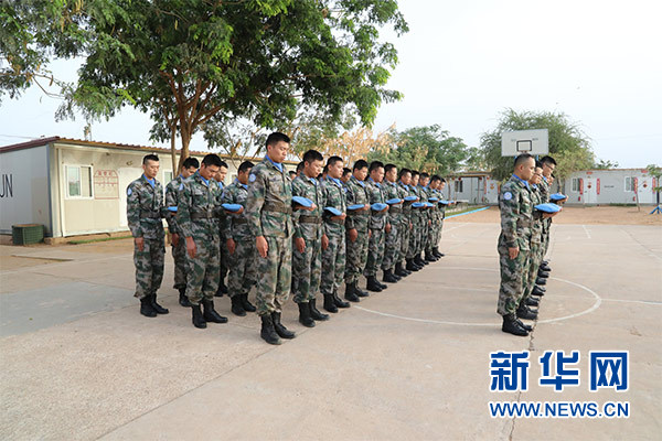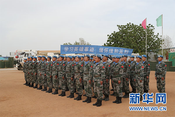 祭奠儀式上,大型機(jī)械鳴笛三聲,哀思樂曲響起,全體官兵整裝列隊(duì),集體脫帽為犧牲在維和戰(zhàn)場上的英烈默哀三分鐘。隨后,官兵代表致辭,追憶維和英烈們無私奉獻(xiàn)、舍生取義的光輝事跡,表達(dá)為達(dá)爾富爾地區(qū)和平建設(shè)而努力奮斗的堅(jiān)定決心。