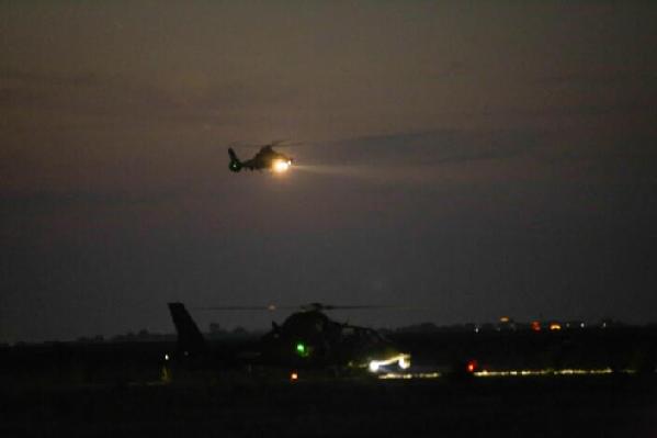 ????夜間,多架多型號武裝直升機(jī)帶彈起飛(4月18日攝)。