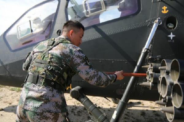 ????軍械員在為新型武裝直升機(jī)裝彈(4月18日攝)。