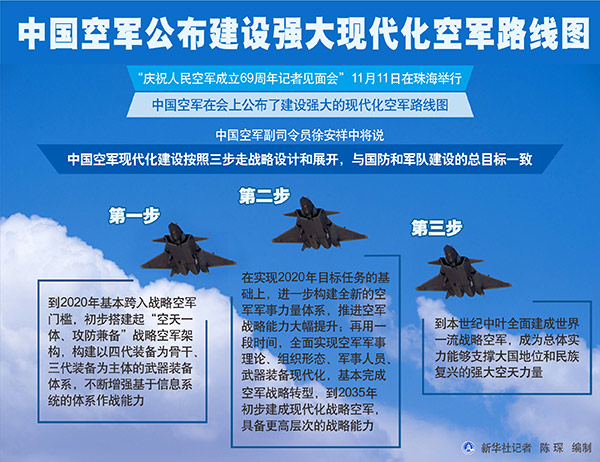 新華社廣州11月11日電(記者黃書波、于曉泉)“慶祝人民空軍成立69周年記者見面會”11日在珠海舉行,中國空軍在會上公布了建設(shè)強(qiáng)大的現(xiàn)代化空軍路線圖。