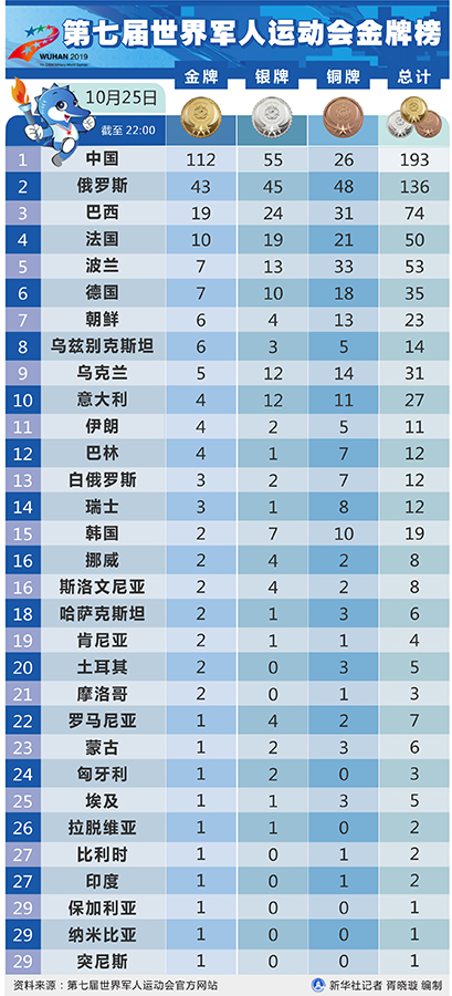 25日比賽結束后,中國軍團以112金55銀26銅繼續(xù)位居金牌榜和獎牌榜首位,俄羅斯隊以43金45銀48銅位居金牌榜和獎牌榜次席,巴西隊以19金24銀31銅位居金牌榜和獎牌榜第三。