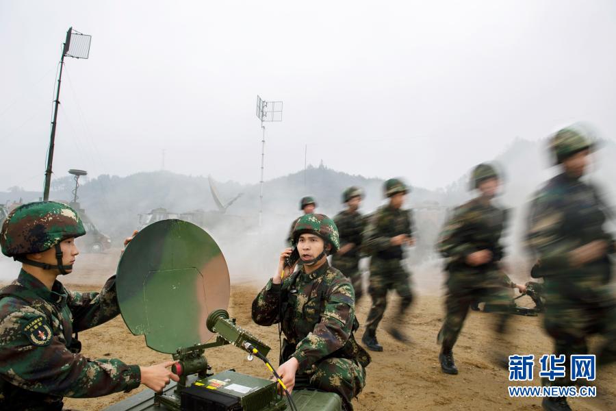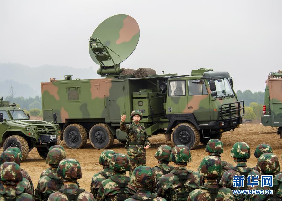 俞細文(左二)在野外訓練場迅速架設通信臺站(12月11日攝)。新華社發(fā)(劉明松 攝)
