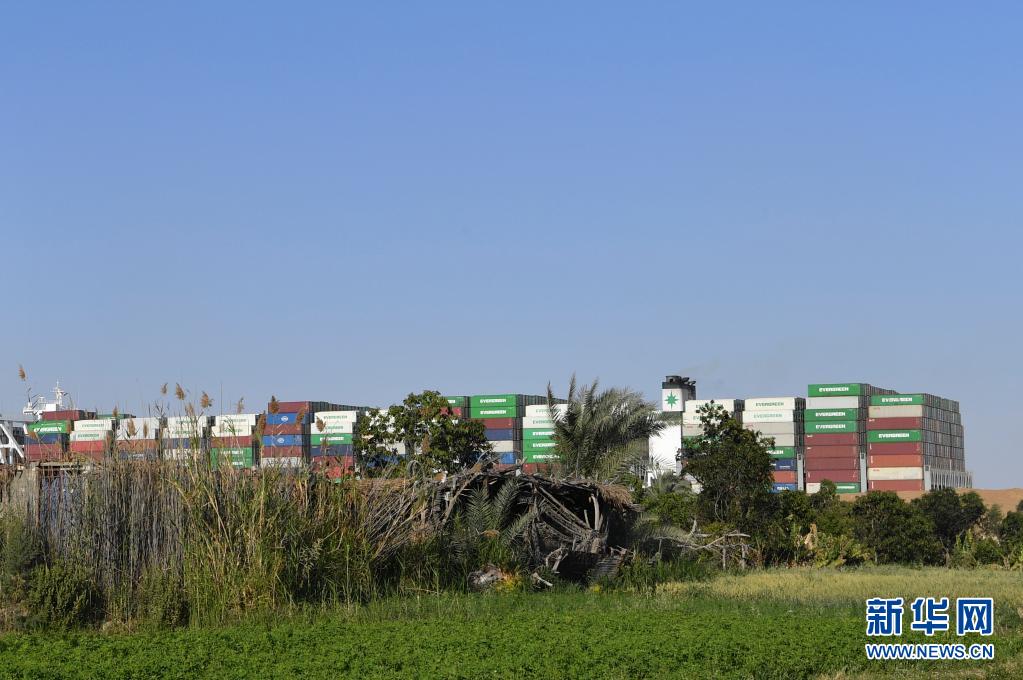 這是3月29日拍攝的移動(dòng)至埃及蘇伊士運(yùn)河正常航道上的重型貨輪。