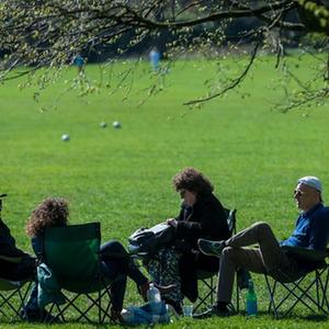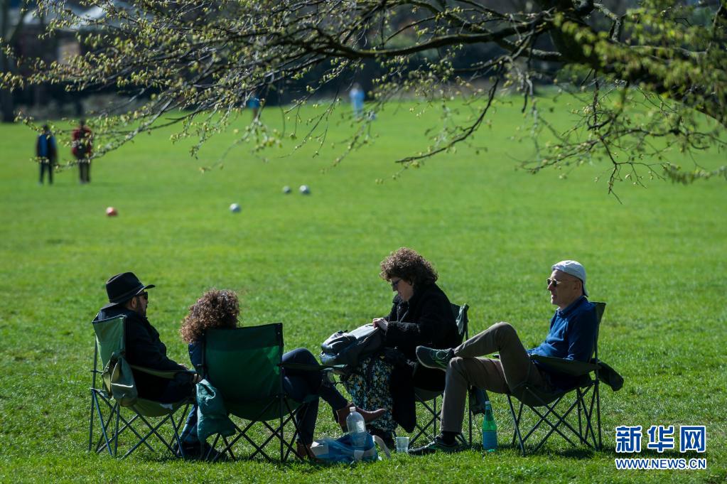 3月29日,人們在英國倫敦的報(bào)春花山享受陽光。