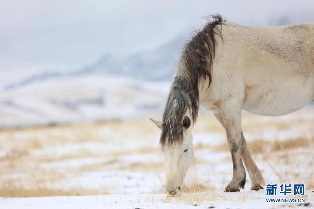 3月31日,在山丹馬場(chǎng),一匹馬在風(fēng)雪中覓食。