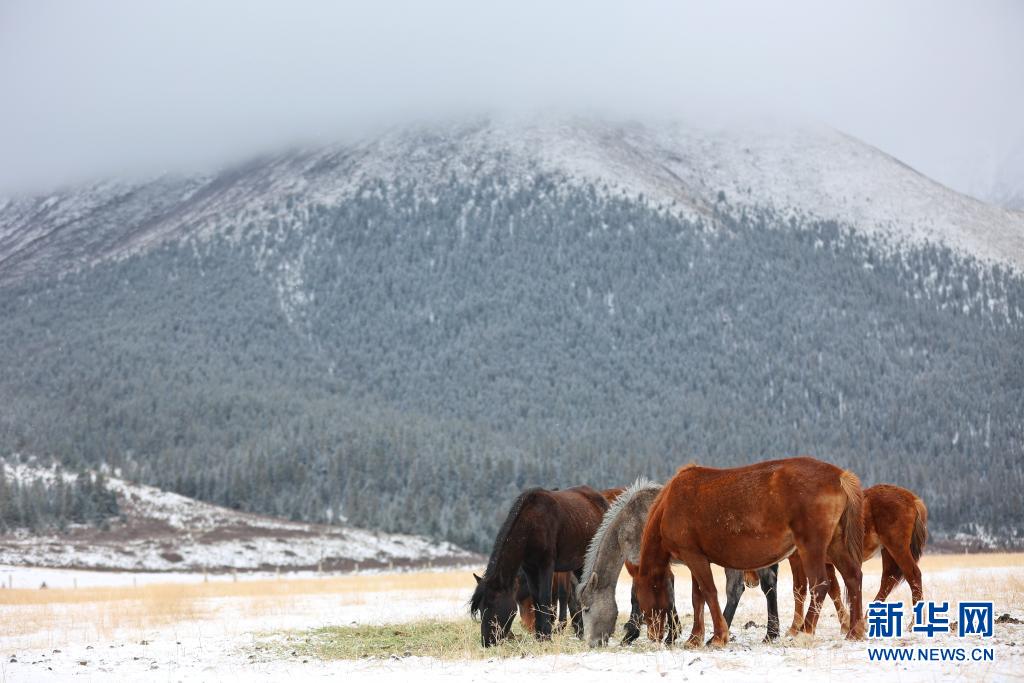 當日,受冷空氣影響,位于甘肅省河西走廊中部、祁連山北麓的山丹馬場降雪,馬群在雪原上奔跑覓食,構(gòu)成了一幅壯美高原雪景 。
