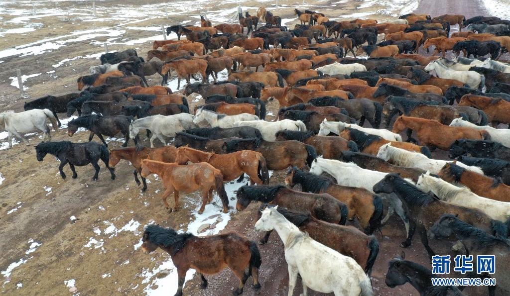 3月31日在山丹馬場拍攝的風(fēng)雪中的馬群(無人機(jī)照片)。