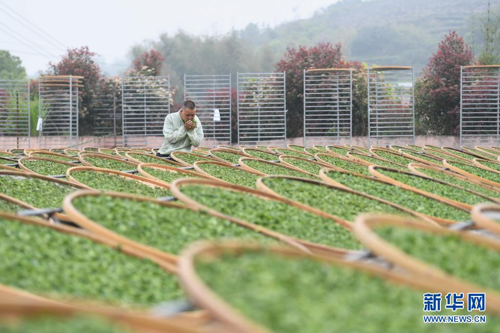 4月2日,制茶師傅在福鼎佳陽畬族鄉(xiāng)一茶廠識(shí)別日曬茶葉的香氣。新華社記者 林善傳 攝