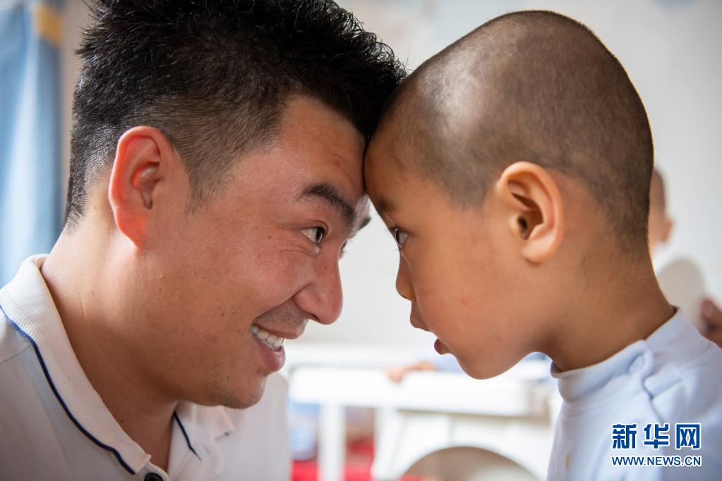 在太原市社會(huì)(兒童)福利院,黨龍祥在和一名小朋友交流(5月31日攝)。新華社記者 楊晨光 攝
