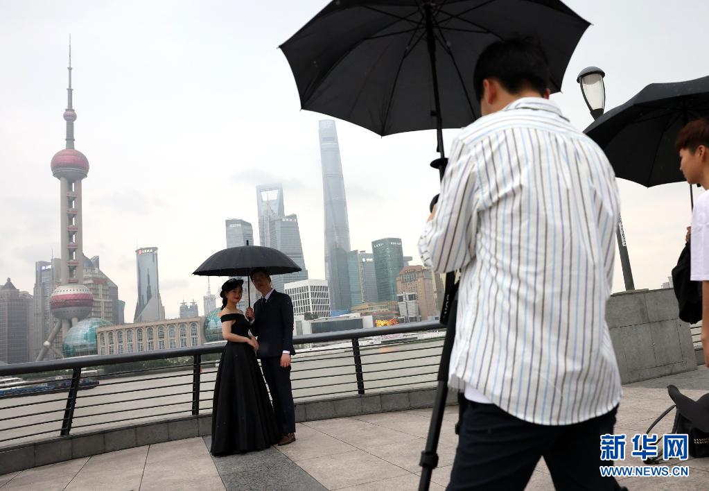 6月10日,游客在雨中的上海外灘拍攝藝術(shù)照片。