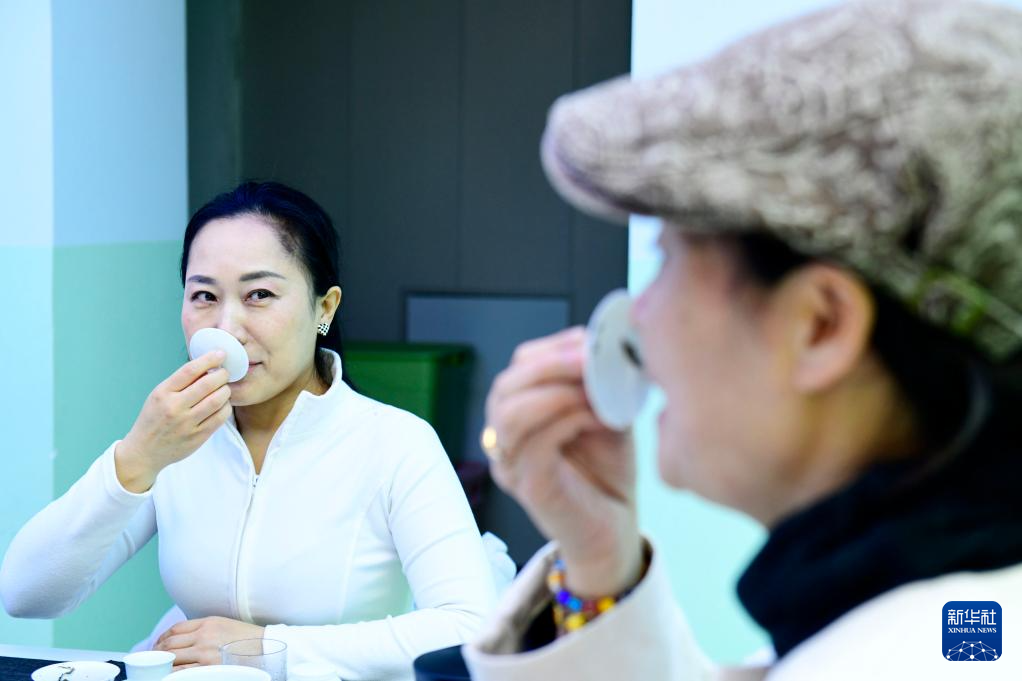12月25日,在威海市“阅伴新华”文化书院,社区居民在学习茶艺。