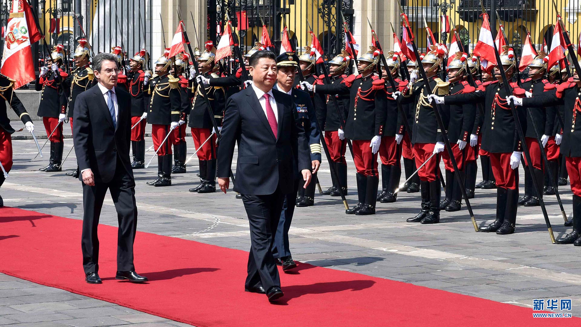 11月21日,國家主席習近平在利馬同秘魯總統(tǒng)庫琴斯基舉行會談。會談前,習近平出席庫琴斯基在總統(tǒng)府前廣場舉行的歡迎儀式。 新華社記者李濤 攝2016-11-23