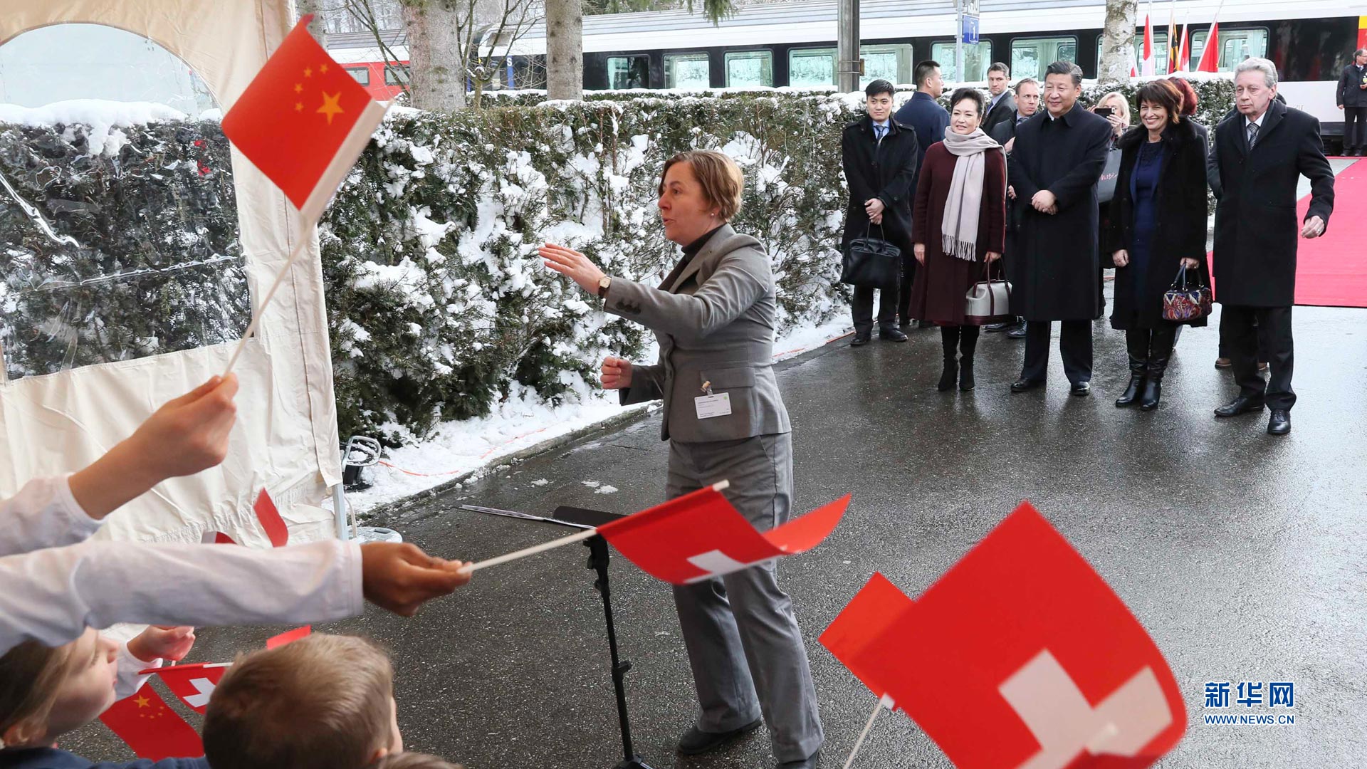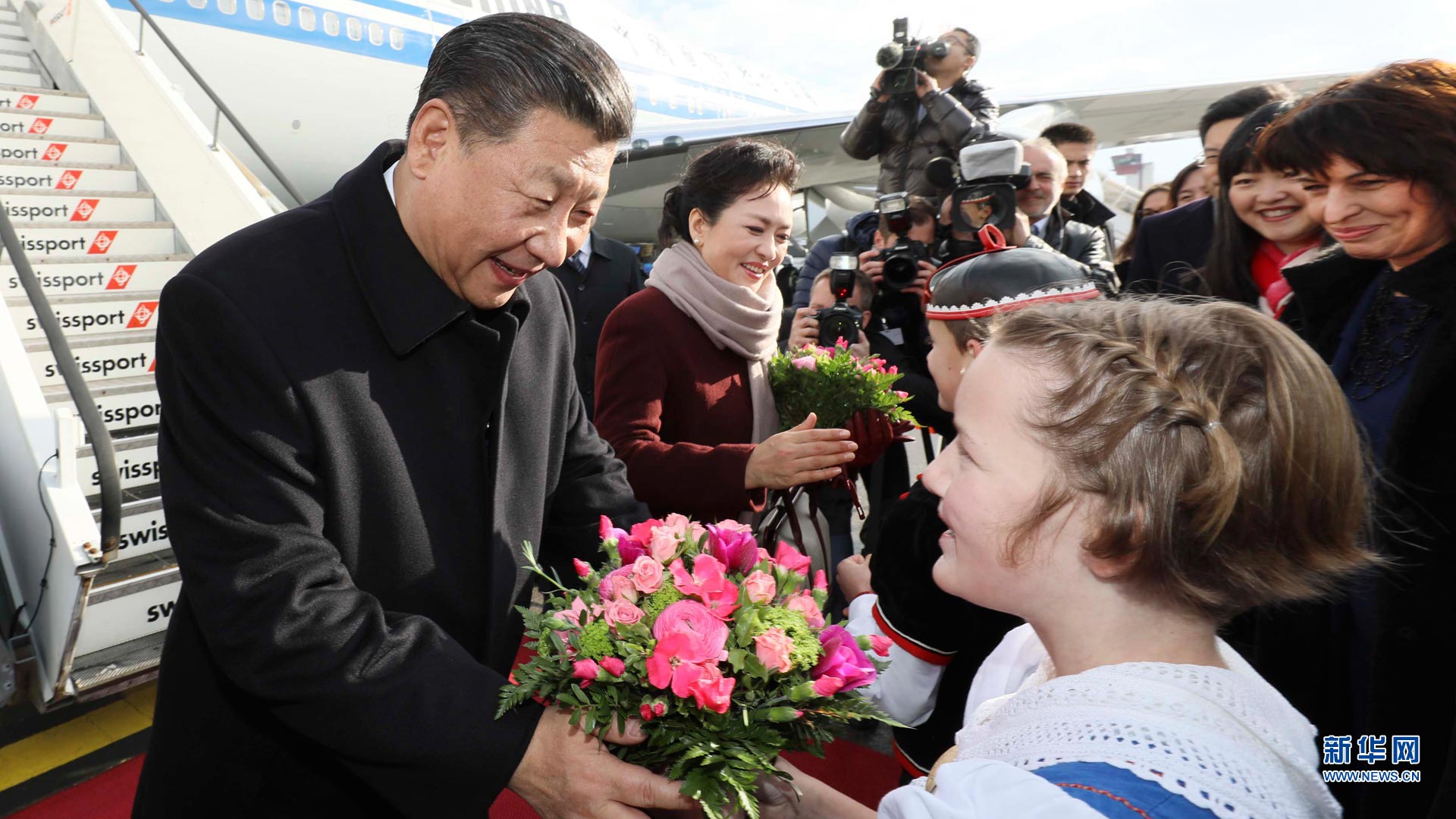1月15日,國(guó)家主席習(xí)近平乘專機(jī)抵達(dá)蘇黎世,開(kāi)始對(duì)瑞士聯(lián)邦進(jìn)行國(guó)事訪問(wèn)。這是當(dāng)?shù)貎和蛄?xí)近平和夫人彭麗媛獻(xiàn)上鮮花。新華社記者蘭紅光攝2017-01-16