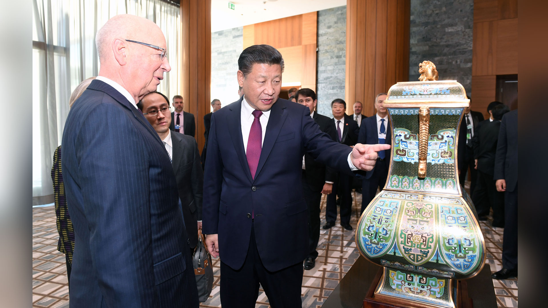 1月17日,國(guó)家主席習(xí)近平在瑞士達(dá)沃斯會(huì)見(jiàn)世界經(jīng)濟(jì)論壇主席施瓦布。這是習(xí)近平向施瓦布介紹中華人民共和國(guó)贈(zèng)送給世界經(jīng)濟(jì)論壇的四面方尊。新華社記者 饒愛(ài)民 攝2017-01-18
