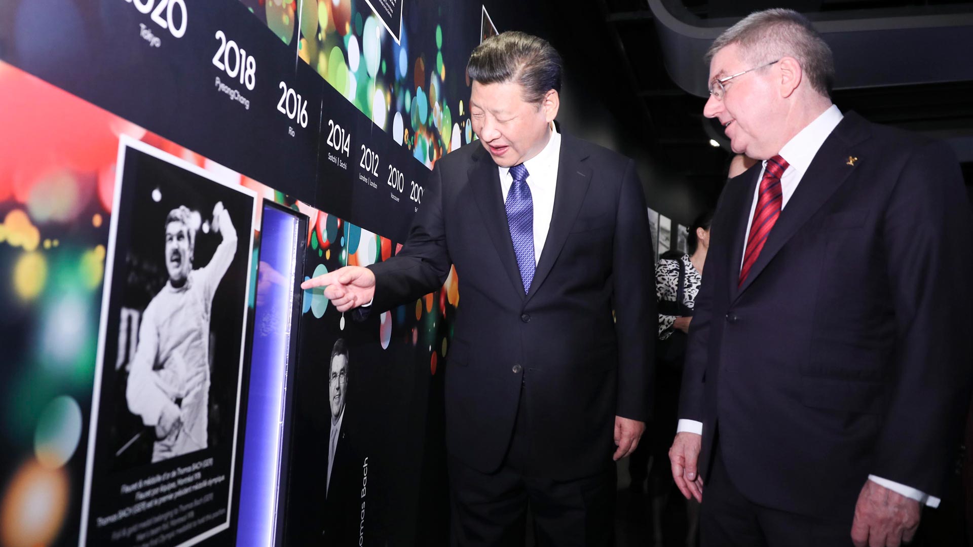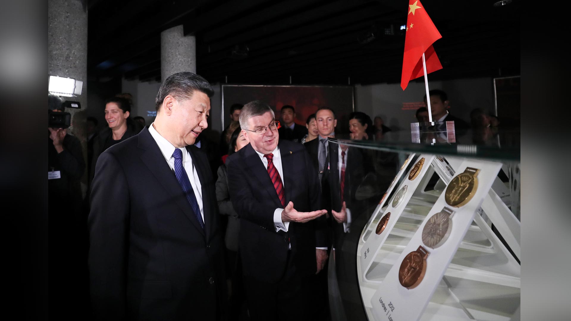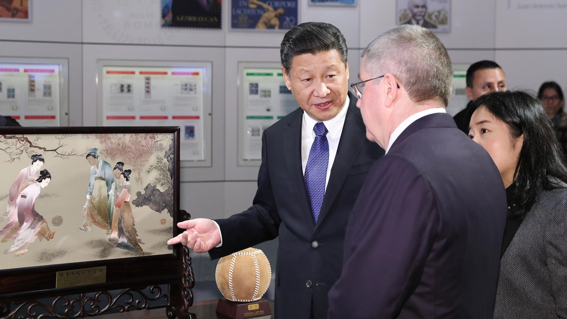 1月18日,國(guó)家主席習(xí)近平在瑞士洛桑國(guó)際奧林匹克博物館會(huì)見(jiàn)國(guó)際奧林匹克委員會(huì)主席巴赫。這是會(huì)見(jiàn)后,習(xí)近平在巴赫陪同下參觀國(guó)際奧林匹克博物館。新華社記者 姚大偉 攝2017-01-19