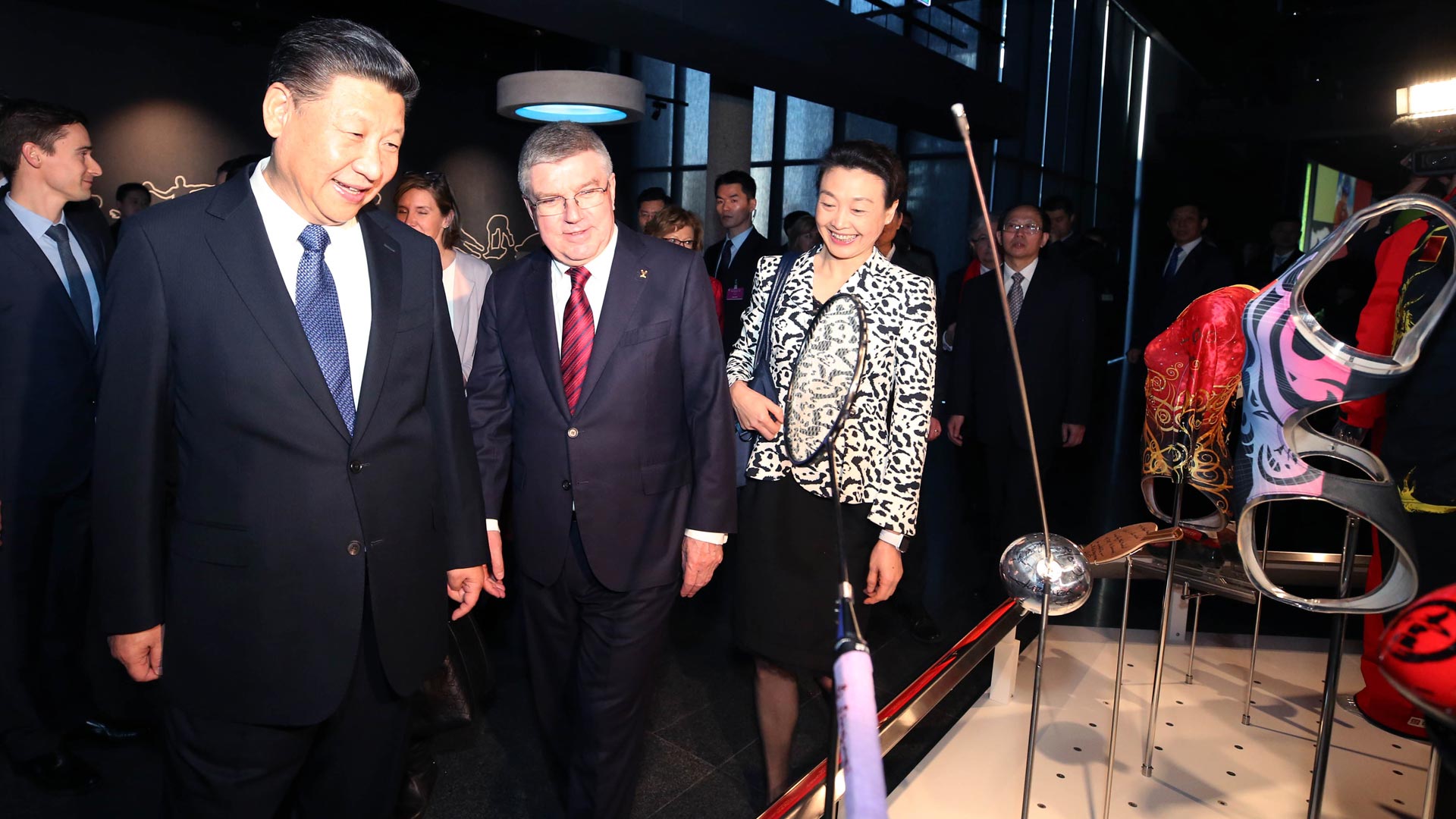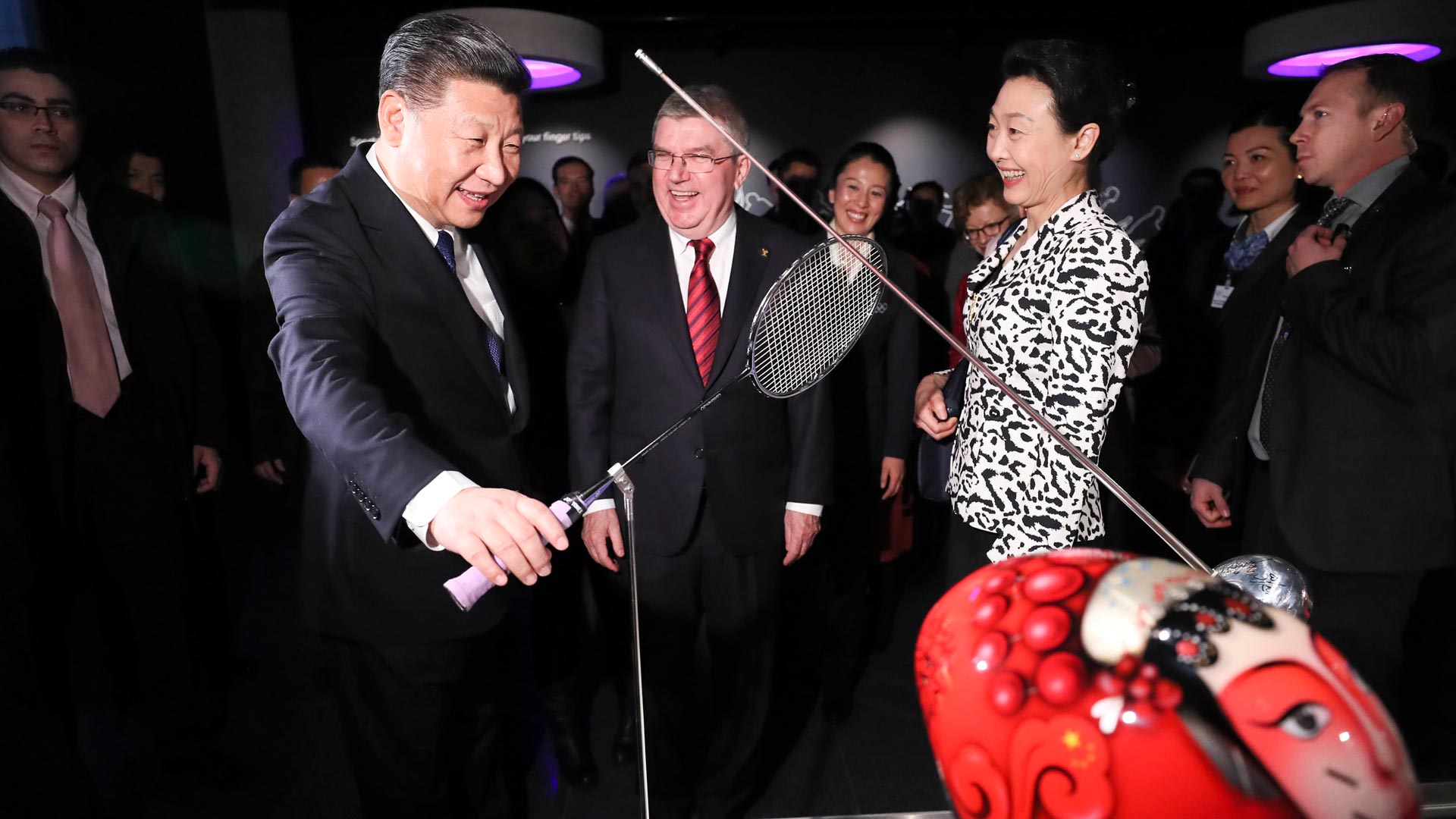 1月18日,國(guó)家主席習(xí)近平在瑞士洛桑國(guó)際奧林匹克博物館會(huì)見(jiàn)國(guó)際奧林匹克委員會(huì)主席巴赫。這是習(xí)近平在巴赫陪同下,參觀羽毛球世界冠軍李玲蔚用過(guò)的球拍。新華社記者 蘭紅光 攝2017-01-19