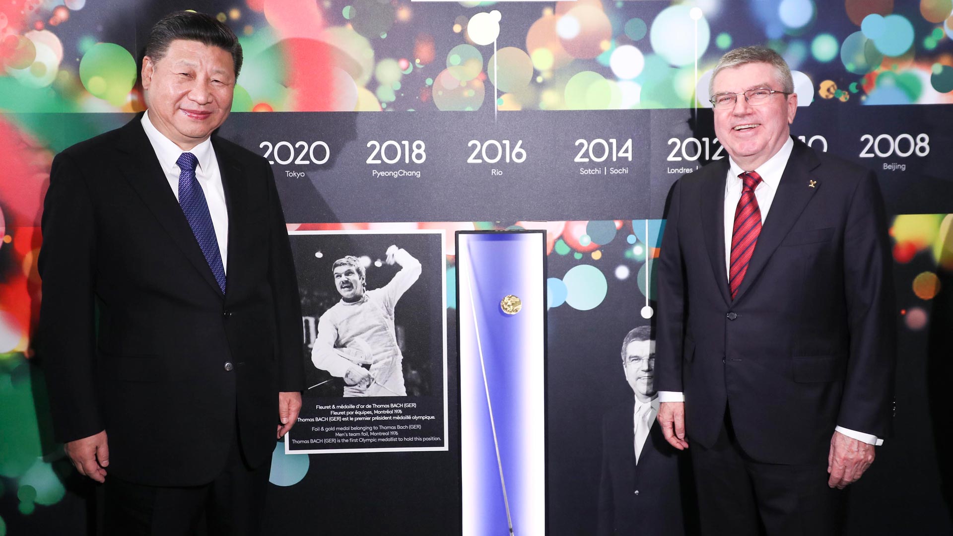 1月18日,國(guó)家主席習(xí)近平在瑞士洛桑國(guó)際奧林匹克博物館會(huì)見(jiàn)國(guó)際奧林匹克委員會(huì)主席巴赫。這是習(xí)近平與巴赫在巴赫作為擊劍運(yùn)動(dòng)員參加奧運(yùn)會(huì)的照片前合影。新華社記者 蘭紅光 攝2017-01-19