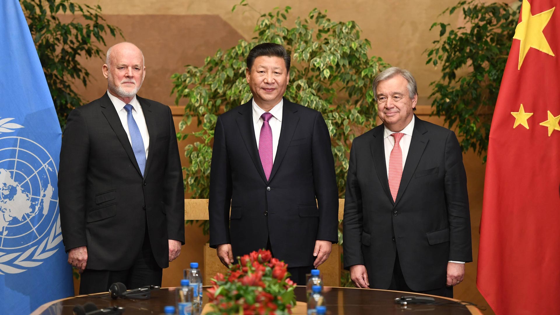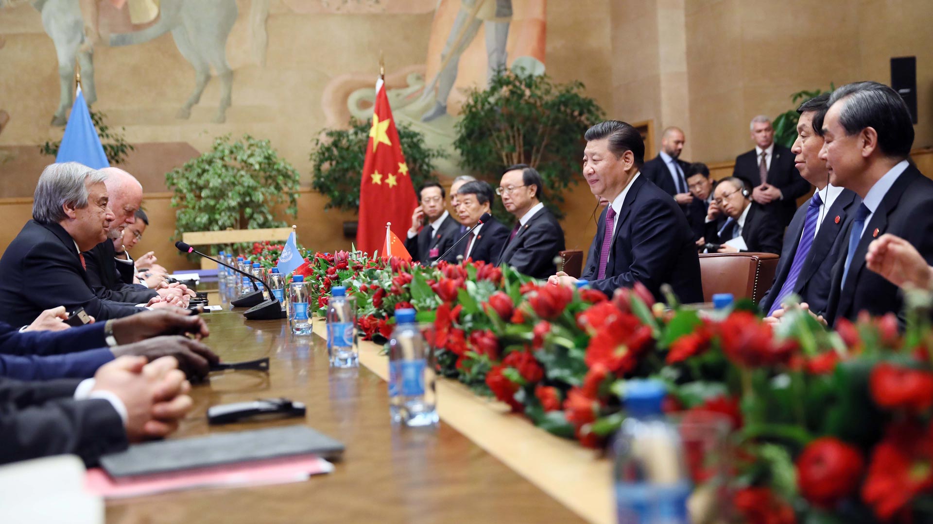 1月18日,國(guó)家主席習(xí)近平在瑞士日內(nèi)瓦萬(wàn)國(guó)宮會(huì)見(jiàn)第71屆聯(lián)合國(guó)大會(huì)主席湯姆森和聯(lián)合國(guó)秘書(shū)長(zhǎng)古特雷斯。 新華社記者 張鐸 攝2017-01-19