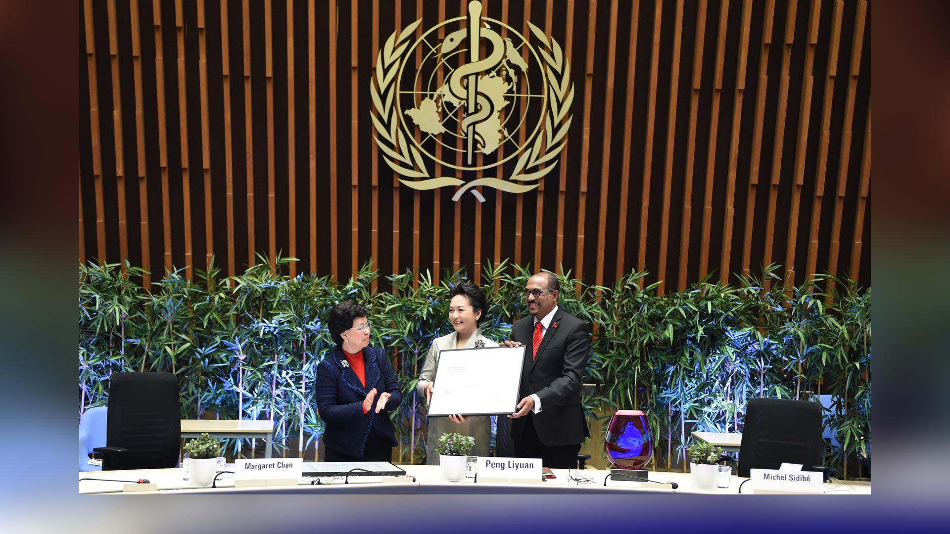 1月18日,國(guó)家主席習(xí)近平夫人、世界衛(wèi)生組織結(jié)核病和艾滋病防治親善大使彭麗媛應(yīng)世界衛(wèi)生組織總干事陳馮富珍和聯(lián)合國(guó)艾滋病規(guī)劃署執(zhí)行主任西迪貝邀請(qǐng),在瑞士日內(nèi)瓦出席為她舉行的親善大使任期續(xù)延暨頒獎(jiǎng)儀式。這是世界衛(wèi)生組織總干事陳馮富珍向彭麗媛頒發(fā)世衛(wèi)組織榮譽(yù)勛章。新華社記者謝環(huán)馳攝2017-01-19