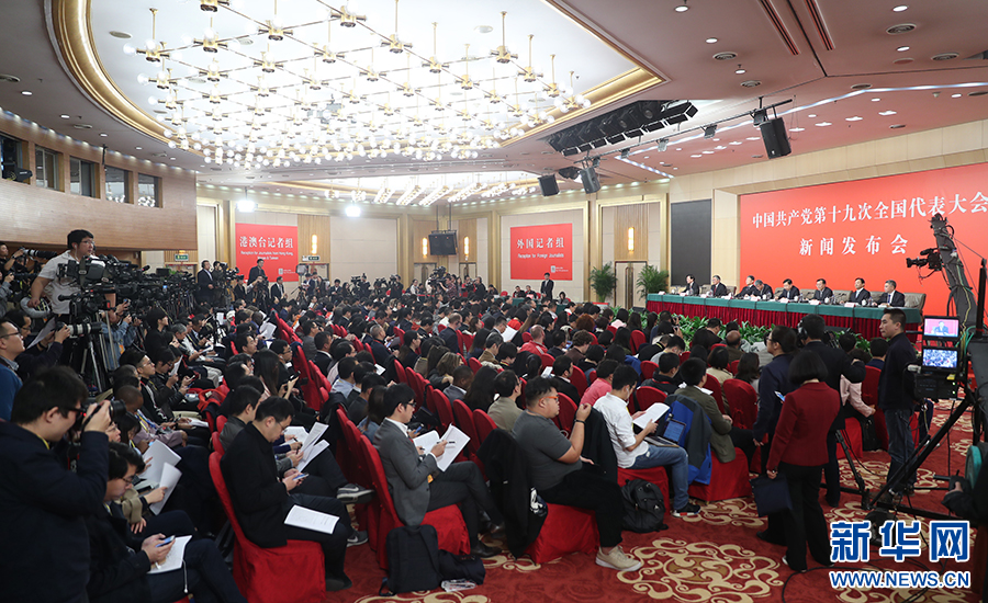 10月26日上午10:00,中國共產(chǎn)黨第十九次全國代表大會新聞發(fā)言人在梅地亞賓館二層新聞發(fā)布廳召開專題新聞發(fā)布會,請有關(guān)方面負(fù)責(zé)人解讀十九大報(bào)告,并回答記者關(guān)心的問題。圖為新聞發(fā)布會現(xiàn)場。新華網(wǎng) 王翰林 攝