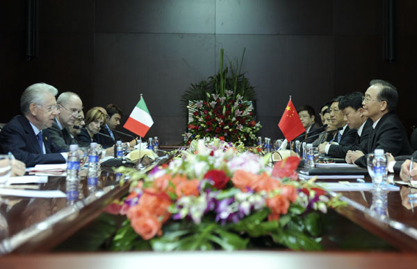 ??? 11月5日,中國國務院總理溫家寶在老撾首都萬象會見出席第九屆亞歐首腦會議的意大利總理蒙蒂。 新華社記者張鐸攝