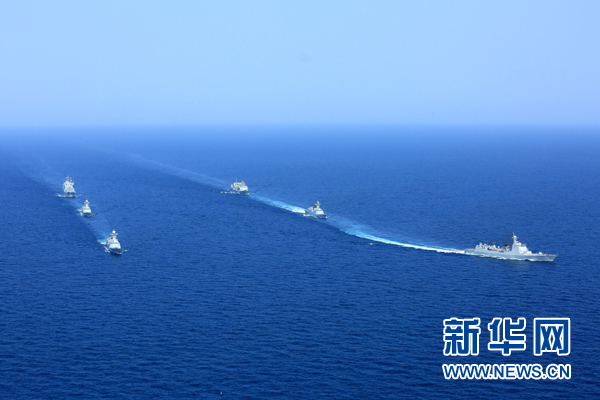 圓滿完成亞丁灣、索馬里海域護(hù)航任務(wù)的中國(guó)海軍第二十批護(hù)航編隊(duì)(右)與第二十一批護(hù)航編隊(duì)分航,駛離亞丁灣海域開(kāi)始執(zhí)行環(huán)球訪問(wèn)任務(wù)(2015年8月23日攝)。新華社發(fā)(曾濤 攝)