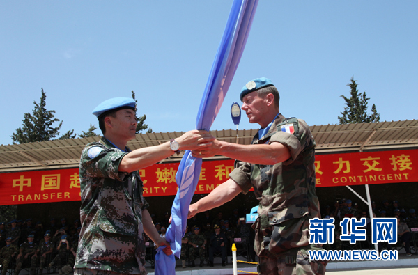 在黎巴嫩南部辛尼亞村的中國(guó)營(yíng)舉行的中國(guó)赴黎維和部隊(duì)輪換交接儀式上,聯(lián)合國(guó)駐黎巴嫩臨時(shí)部隊(duì)(聯(lián)黎部隊(duì))參謀長(zhǎng)皮埃爾(右)將聯(lián)合國(guó)旗交到中國(guó)第16批赴黎維和部隊(duì)指揮長(zhǎng)黃云手中(5月22日攝)。新華社記者 李良勇 攝