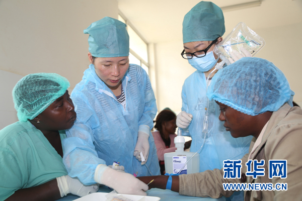 中國(guó)人民解放軍援助西非抗擊埃博拉疫情醫(yī)療隊(duì)為弗里敦中塞友好醫(yī)院開(kāi)展輸液培訓(xùn)活動(dòng)(2014年12月10日攝)。新華社發(fā)(戴欣 攝)