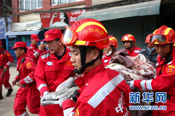 在尼泊爾首都加德滿都,中國(guó)國(guó)際救援隊(duì)搜救隊(duì)員從因地震坍塌的樓房中抬出一名幸存者(2015年4月26日攝)。新華社記者 白陽(yáng) 攝