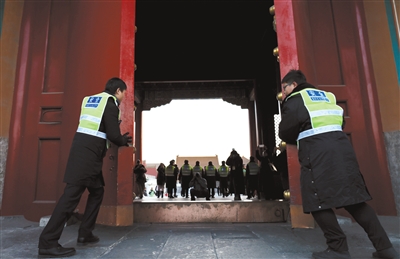 昨天下午,單霽翔與其他“故宮人”一起,進(jìn)行年度最后一次開放區(qū)域清場封門的檢查,并見證故宮關(guān)上大門。