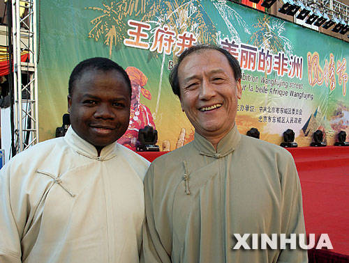 資料圖片:2006年10月31日,中國相聲演員丁廣泉(右)和他的非洲徒弟在王府井步行街參加非洲風(fēng)情節(jié)活動時合影。