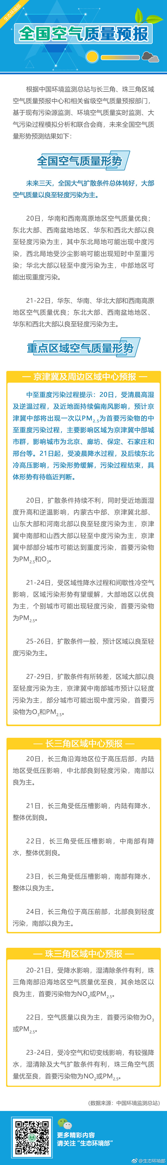 據(jù)生態(tài)環(huán)境部官方微博消息,未來(lái)三天(4月20-22日),全國(guó)大氣擴(kuò)散條件總體轉(zhuǎn)好,大部空氣質(zhì)量以良至輕度污染為主。