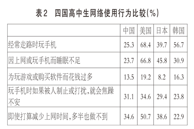 如果中學生的在線活動影響了現(xiàn)實生活,并引發(fā)沖突,就需要給予引導。由表2的數(shù)據(jù)可見,25.3%的中國高中生經(jīng)常走路時玩手機,低于其他三國,美國、韓國和日本依次為68.4%、56.7%和39.7%;23.7%的中國高中生因上網(wǎng)或玩手機而睡眠不足,低于其他三國,美國、日本和韓國依次為66.8%、45.8%和30.9%;13.5%的中國高中生因玩游戲或購買軟件而花錢過多,在四國中居第三,美國和韓國依次為19.2%和16.3%,分別比中國高5.7和2.8個百分點,日本為8.2%,比中國低5.3個百分點??梢?,美國高中生網(wǎng)絡(luò)行為影響現(xiàn)實生活的最多,而中國高中生比較理性。