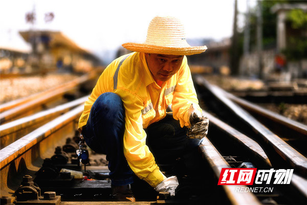 在相隔不到20米的作業(yè)地點(diǎn),長沙信號工區(qū)工長胡正海帶領(lǐng)工友們對另一處道岔、軌道電路等設(shè)備進(jìn)行巡視和設(shè)備注油作業(yè)?!叭藭蚋邷靥鞖怙@得更加疲憊,設(shè)備也會受到高溫天氣的影響,所以無論太陽多么炙熱,設(shè)備巡視必不可少?!焙R贿叢梁挂贿吔榻B。