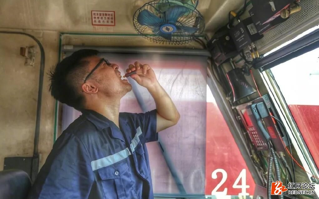 庫內(nèi)的機(jī)車車廂如同“蒸桑拿”,登車作業(yè)前,都會喝一支藿香正氣液,提前做好防暑工作。