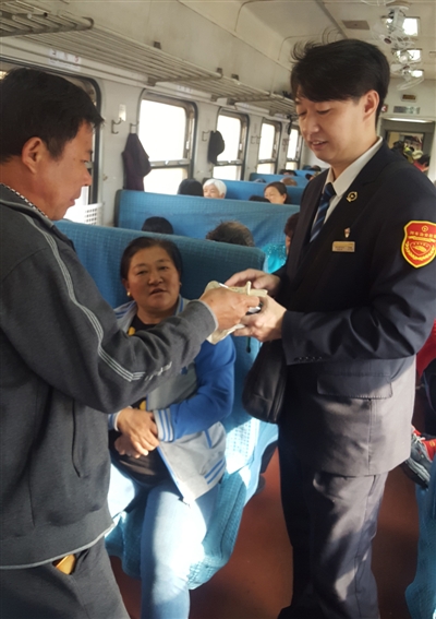 目前,除了四個大站提供售票服務(wù)外,7053次經(jīng)過的其他20個小站都是上車補票。圖為列車員正在為乘客補票。