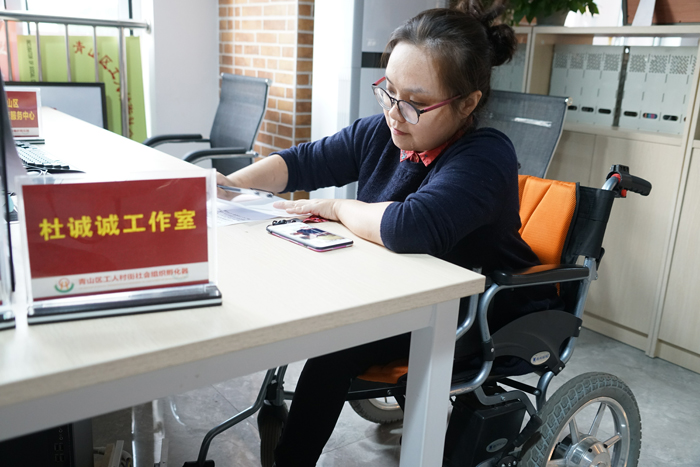 32歲的杜誠誠是一名社區(qū)殘疾人協(xié)理員,從小患有神經(jīng)纖維瘤,2009年左腿高位截肢。她沒有因此一蹶不振,而是通過讀書堅(jiān)強(qiáng)意志,并萌發(fā)幫助殘疾人的想法。