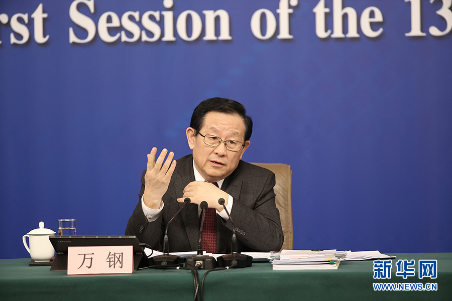 十三屆全國(guó)人大一次會(huì)議新聞中心3月10日上午10時(shí)45分在梅地亞中心多功能廳舉行記者會(huì),邀請(qǐng)科技部部長(zhǎng)萬鋼、政策法規(guī)與監(jiān)督司司長(zhǎng)賀德方、創(chuàng)新發(fā)展司司長(zhǎng)許倞就“加快建設(shè)創(chuàng)新型國(guó)家”相關(guān)問題回答中外記者提問。圖為萬鋼回答記者提問。 新華網(wǎng)/中國(guó)政府網(wǎng) 陳杰 攝