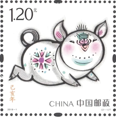 據(jù)介紹,《己亥年》全套郵票以“家”為核心概念。郵票一套兩枚,第一圖名為“肥豬旺福”,肥豬肚藏乾坤,憨態(tài)可掬,以奔跑的動態(tài)表現(xiàn)靈動生風的喜感,象征著正在奔向美好的生活;第二圖名為“五福齊聚”,是首次在一枚生肖郵票中完整體現(xiàn)“全家福”的概念,兩只大豬和三只小豬同時出鏡,其樂融融,寄托新春佳節(jié)合家團圓、五福臨門的美好祝福。