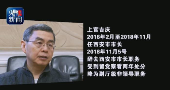 上官吉慶,2016年2月至2018年11月任西安市市長,2018年11月5號辭去西安市市長職務,受到留黨察看兩年處分,降為副廳級非領導職務。