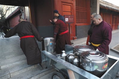雍和宮內(nèi)僧人們搬運(yùn)連夜熬制的臘八粥。