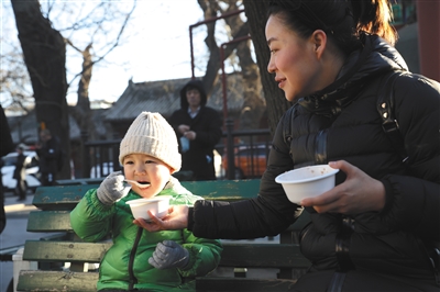 代女士已經(jīng)連續(xù)13年來(lái)雍和宮喝臘八粥了。她說(shuō),自己懷孕時(shí)偶然趕上雍和宮舍粥,因?yàn)樽约菏歉啐g產(chǎn)婦,許愿“母子平安”。隨后每年臘八她都帶上家人來(lái)喝上一碗粥,今年恰逢周末,她就帶上兒子一起來(lái),“參與這個(gè)節(jié)日已經(jīng)成了我們家的傳統(tǒng),每年來(lái)這里祈福納祥?!保ㄓ浾?張彤 攝影/記者 王飛)