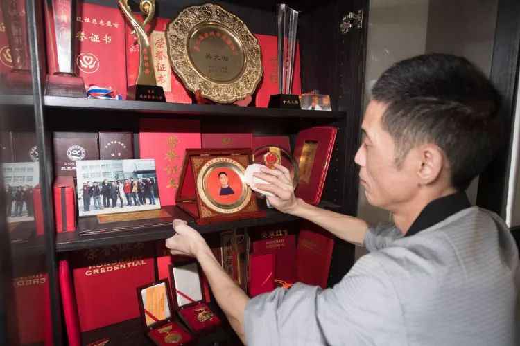 吳元渺在擦拭自己的全國(guó)五一勞動(dòng)獎(jiǎng)?wù)?。柜子里擺放的都是他獲得的各種榮譽(yù)證書和獎(jiǎng)?wù)隆?/font>