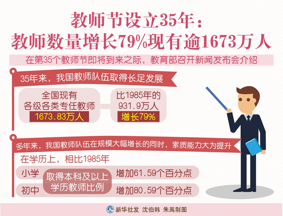 新華社北京9月3日電(記者 胡浩)在第35個(gè)教師節(jié)即將到來之際,教育部召開新聞發(fā)布會介紹,35年來,我國教師隊(duì)伍取得長足發(fā)展。全國現(xiàn)有各級各類專任教師1673.83萬人,比1985年的931.9萬人增長79%。