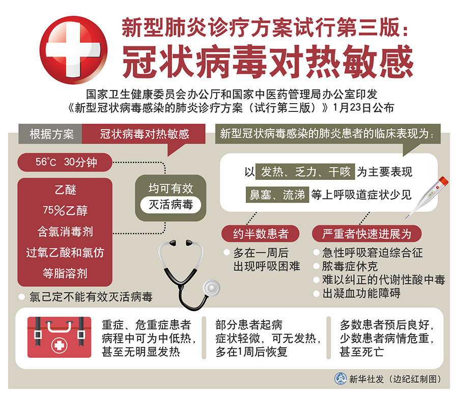 新華社北京1月23日電(記者田曉航、王秉陽)為進(jìn)一步指導(dǎo)全國科學(xué)規(guī)范做好新型冠狀病毒感染的肺炎病例診斷和醫(yī)療救治工作,在組織專家對診療方案進(jìn)行修訂基礎(chǔ)上,國家衛(wèi)生健康委員會辦公廳和國家中醫(yī)藥管理局辦公室印發(fā)《新型冠狀病毒感染的肺炎診療方案(試行第三版)》,23日公布。方案涉及冠狀病毒病原學(xué)特點(diǎn)、此次疫情的臨床特點(diǎn)、病例定義、鑒別診斷、病例的發(fā)現(xiàn)與報告等方面內(nèi)容,給出了包括中醫(yī)治療在內(nèi)的治療方案。