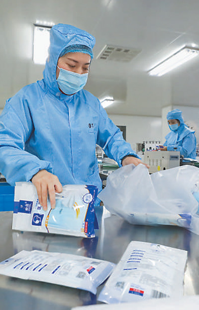 近日,各地口罩生產(chǎn)企業(yè)抓緊生產(chǎn),全力增加市場供應(yīng)。圖為浙江省德清縣一家口罩企業(yè)生產(chǎn)車間,工作人員在包裝口罩。王正 王玨攝影報(bào)道(影像中國)