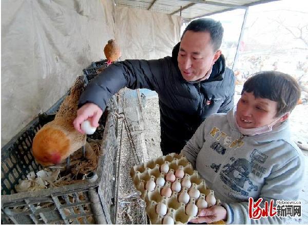 國網饒陽縣供電公司駐豆村第一書記劉月倫(左)幫農戶收雞蛋。 河北日報記者焦磊攝