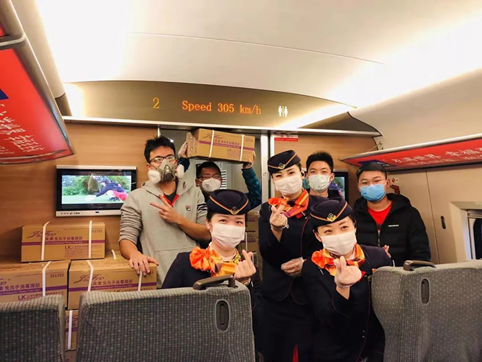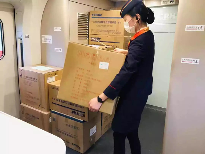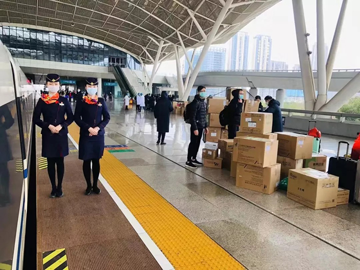 當(dāng)天下午,列車從鄭州東站返回廣州南站時(shí),又接到一批特殊的禮物。中國(guó)鐵路鄭州局有限公司防控所支援武漢的醫(yī)療物資,搭乘高鐵車遞到武漢站。幾名旅客看到乘務(wù)員姑娘們忙碌地搬運(yùn)這些大箱子,都自告奮勇奮前來(lái)幫忙,大家齊心協(xié)力,不一會(huì)兒就把全部物資搬運(yùn)上車。列車載著這些愛(ài)心物資,迅速送達(dá)武漢。