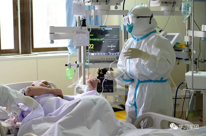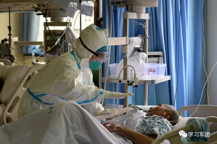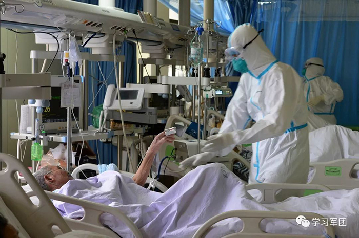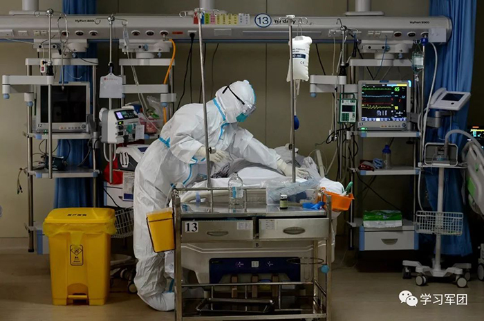 1月27日上午,海軍軍醫(yī)大學(xué)醫(yī)療隊(duì)醫(yī)護(hù)人員在漢口醫(yī)院重癥監(jiān)護(hù)室對(duì)新型冠狀病毒感染的肺炎患者進(jìn)行救治。醫(yī)護(hù)人員對(duì)患者進(jìn)行輸液護(hù)理。解放軍報(bào)記者范顯海攝