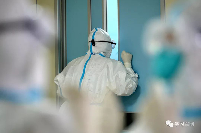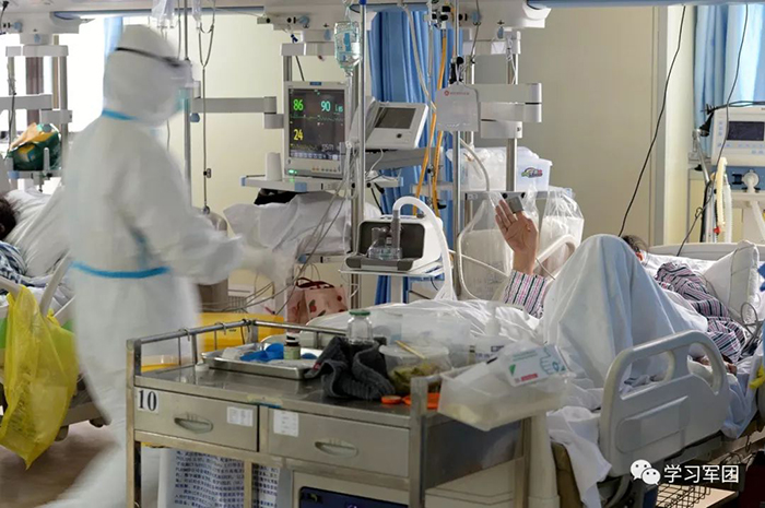 1月27日上午,海軍軍醫(yī)大學(xué)醫(yī)療隊(duì)醫(yī)護(hù)人員在漢口醫(yī)院重癥監(jiān)護(hù)室對(duì)新型冠狀病毒感染的肺炎患者進(jìn)行救治。醫(yī)護(hù)人員與監(jiān)護(hù)室外人員隔門(mén)交流。解放軍報(bào)記者范顯海攝